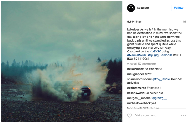 Firma LG nawiązała współpracę z kilkoma wpływowymi fotografami na Instagramie, w tym z Dylanem Furstem, Kyle’m Kuiperem, Jordanem Herschelem, Rory Kramerem, Erikiem Rubensem i Jeremy Cohenem, w celu opracowania, opublikowania i promowania sponsorowanych przez markę zdjęć na Instagramie prezentujących nowy smartfon.