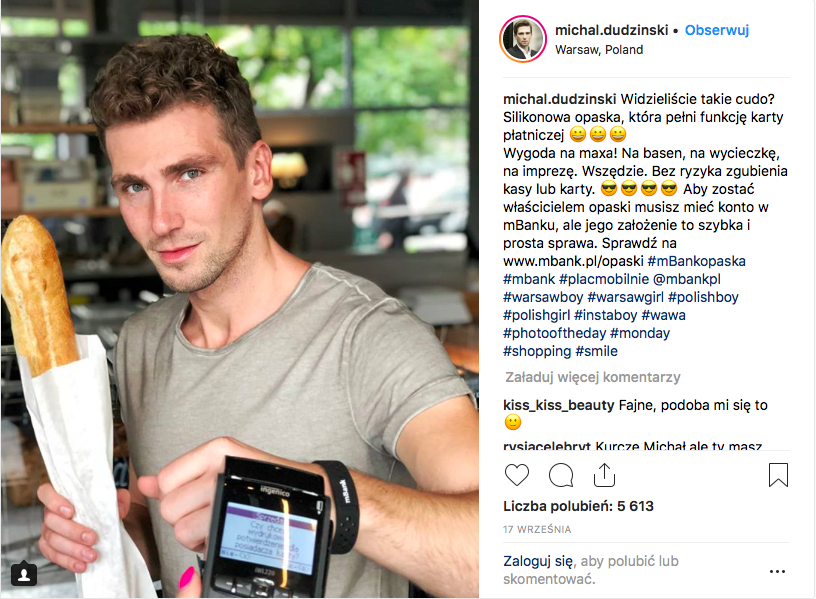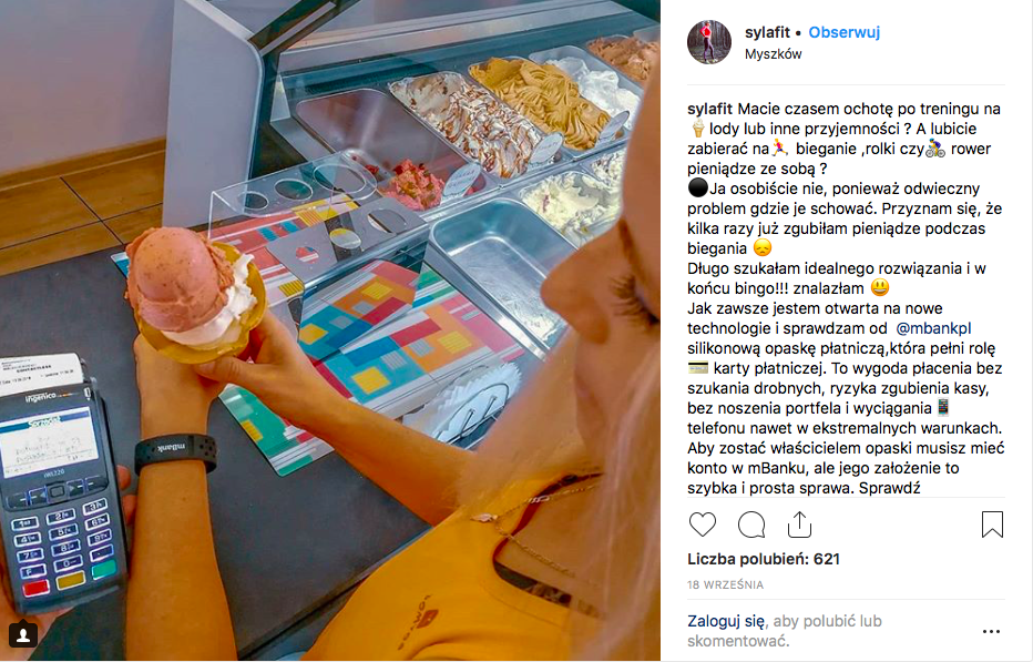 W ramach zadania influencerzy opublikowali post ze zdjęciem pokazując moment używania opaski płatniczej, w tej sposób na poziomie wizualnym podreślając wygodę jej użytkowania.